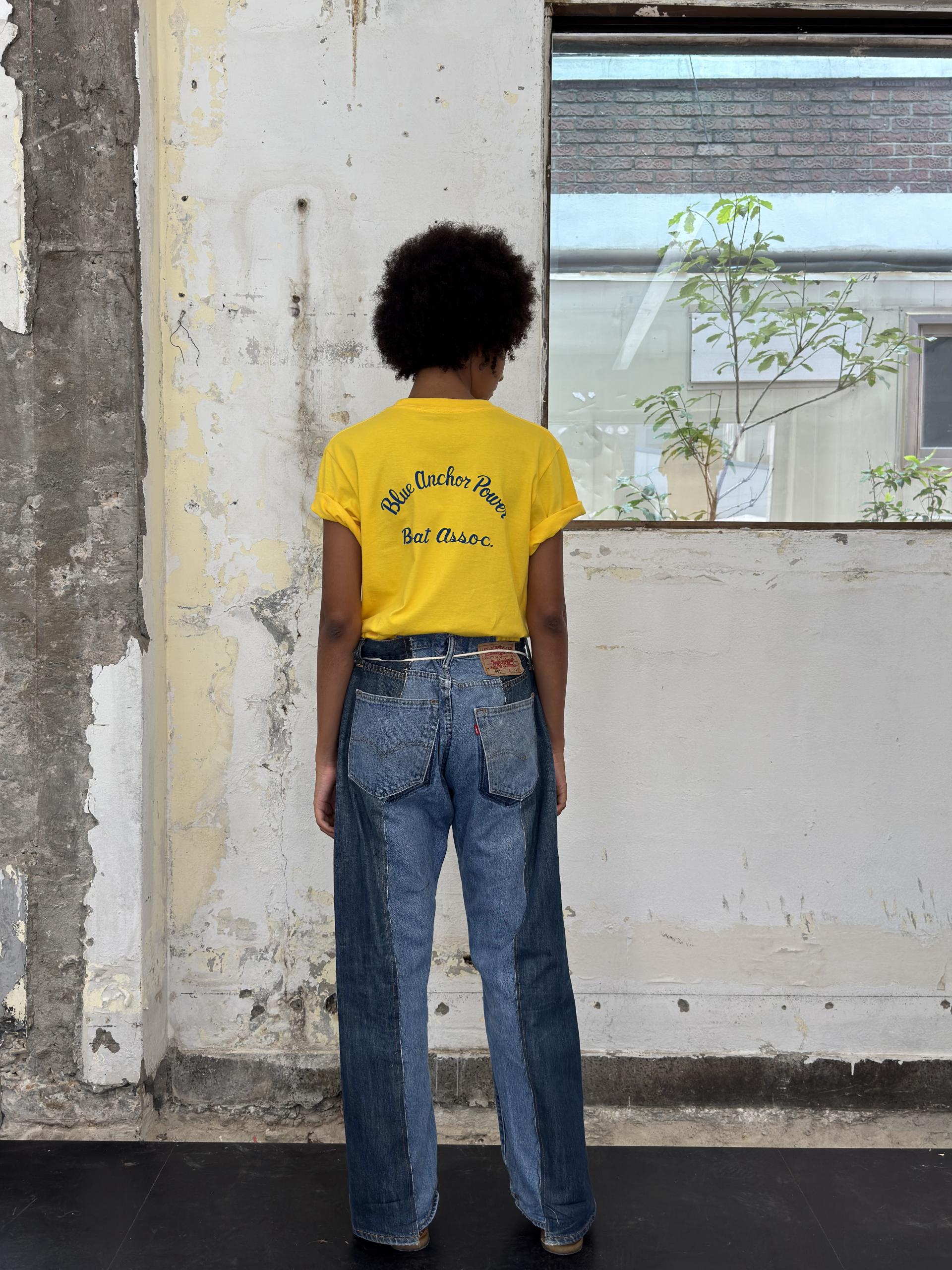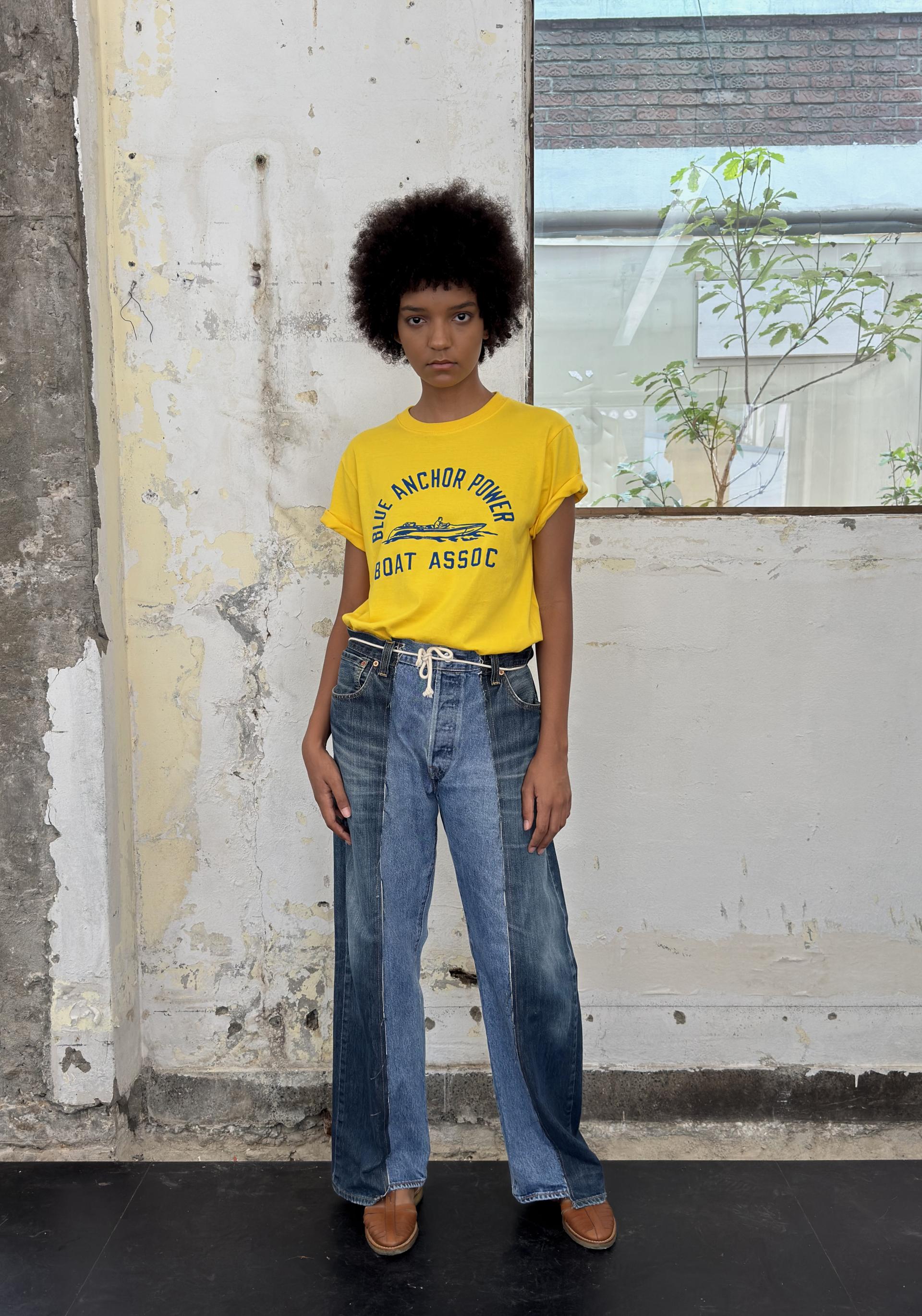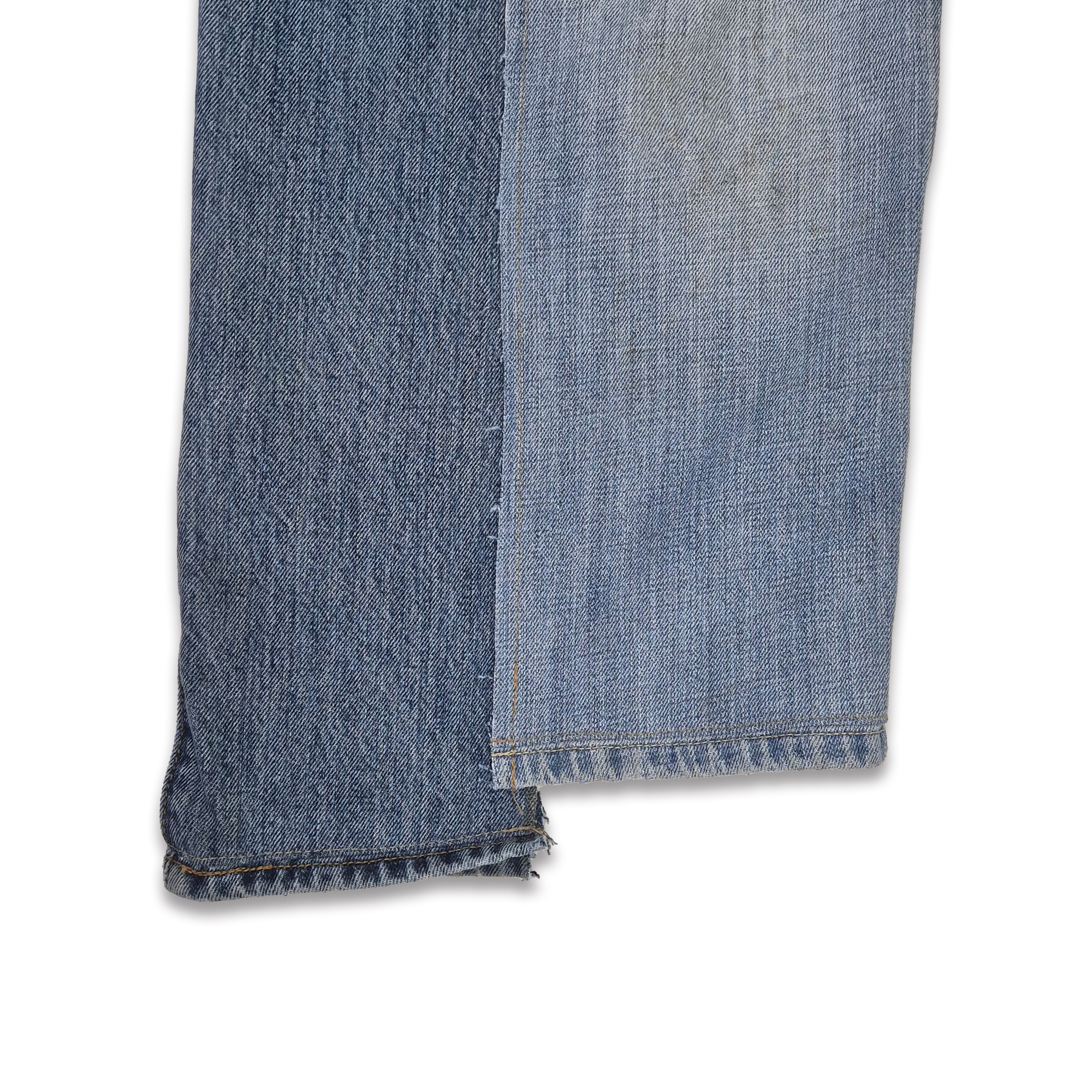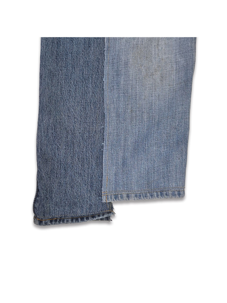 - 색상이 다른 두 벌의 빈티지 데님 팬츠를 사용하여 에클렉틱한 무드 전달