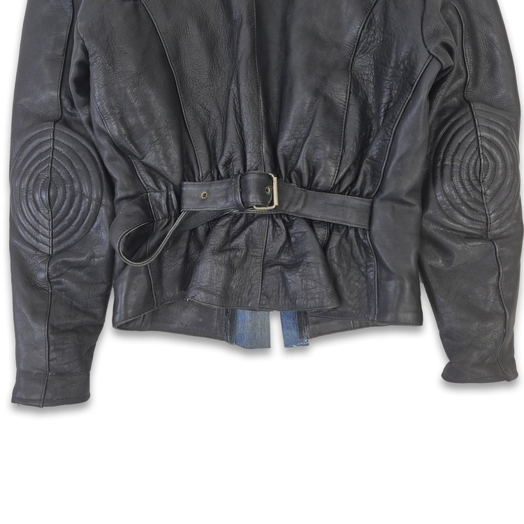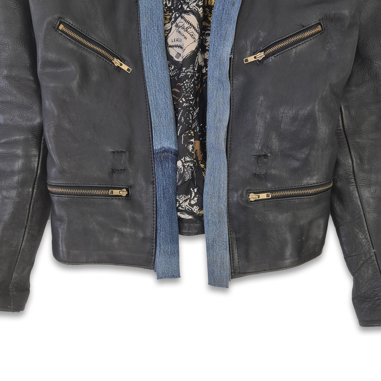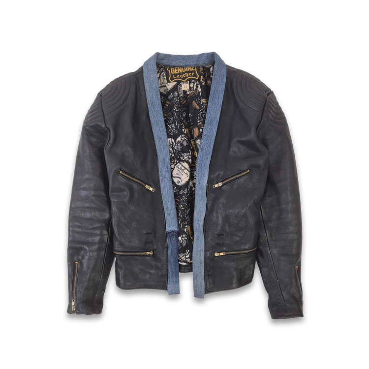 - 데님 소재와 made in usa leather jacket 을 결합하여 산주로 형태로 제작