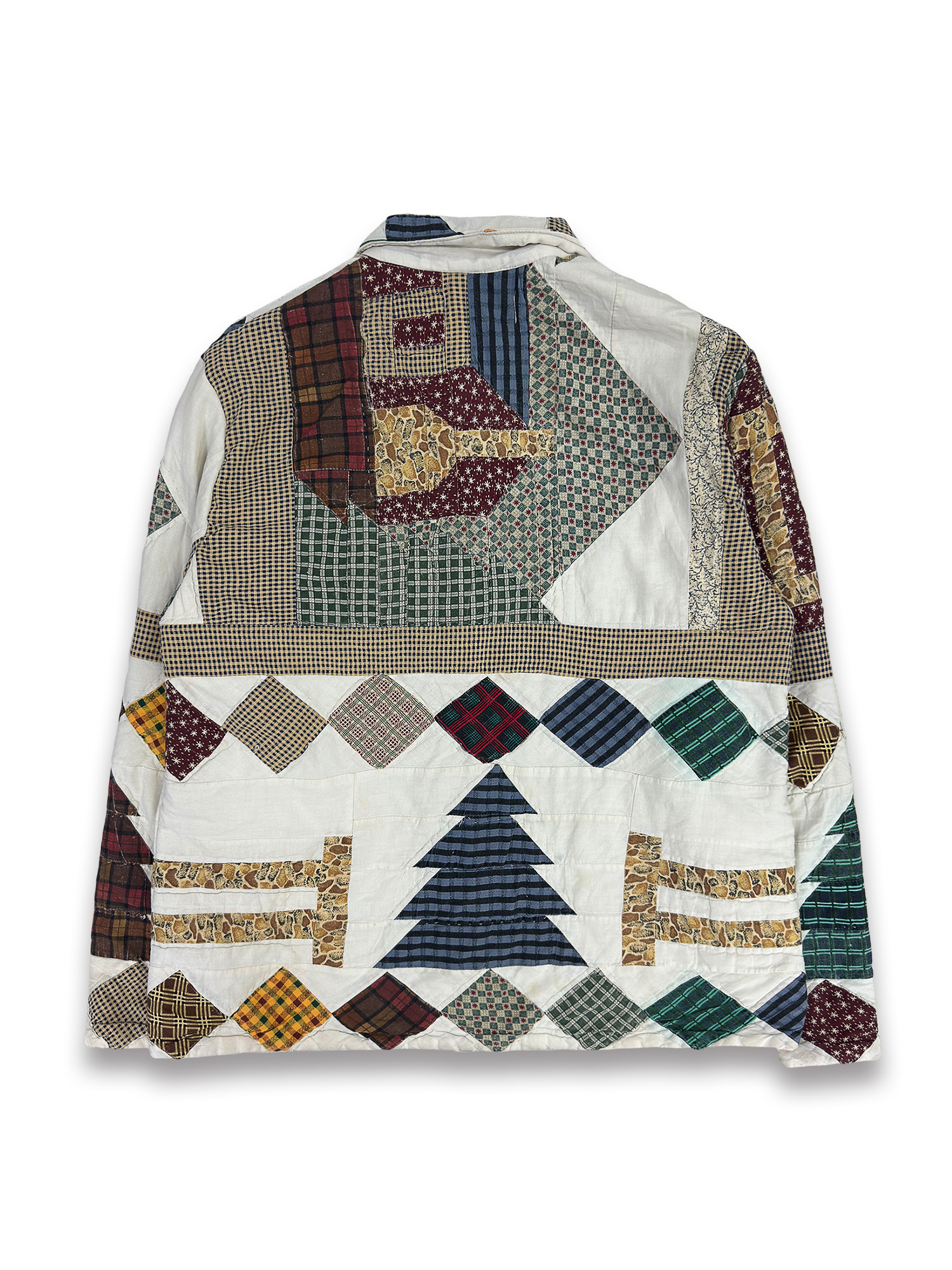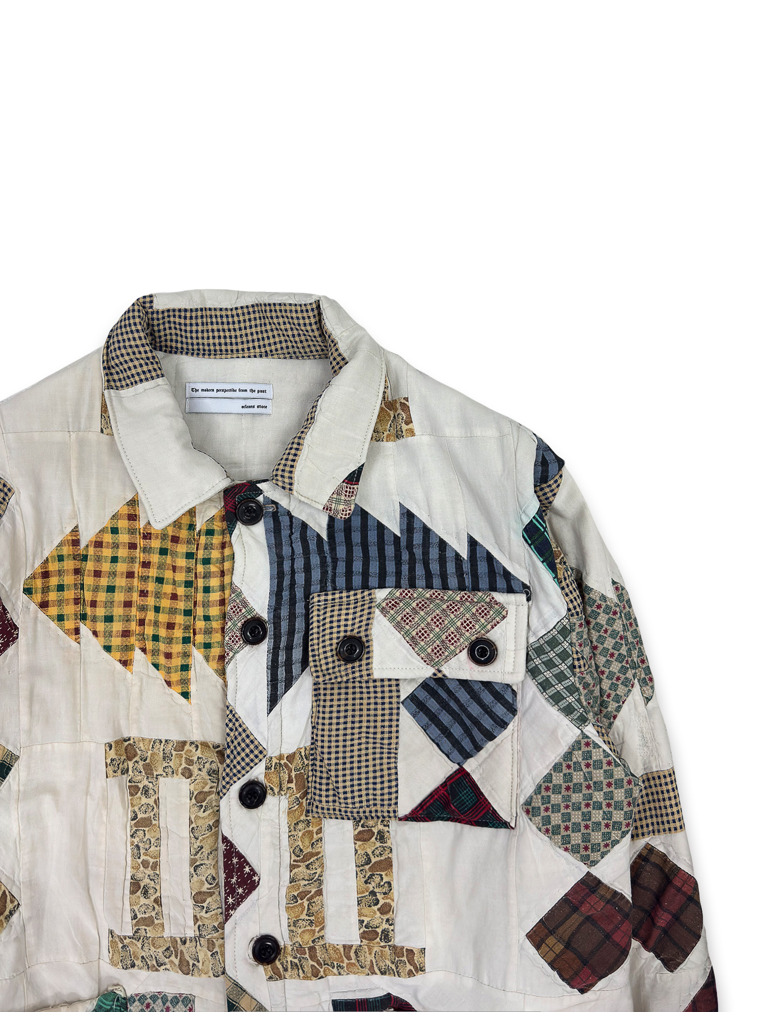 - 퀼트 패턴들이 정교하게 배열되어 있으며, 버튼 여밈과 패치 포켓의 실용적인 디테일.