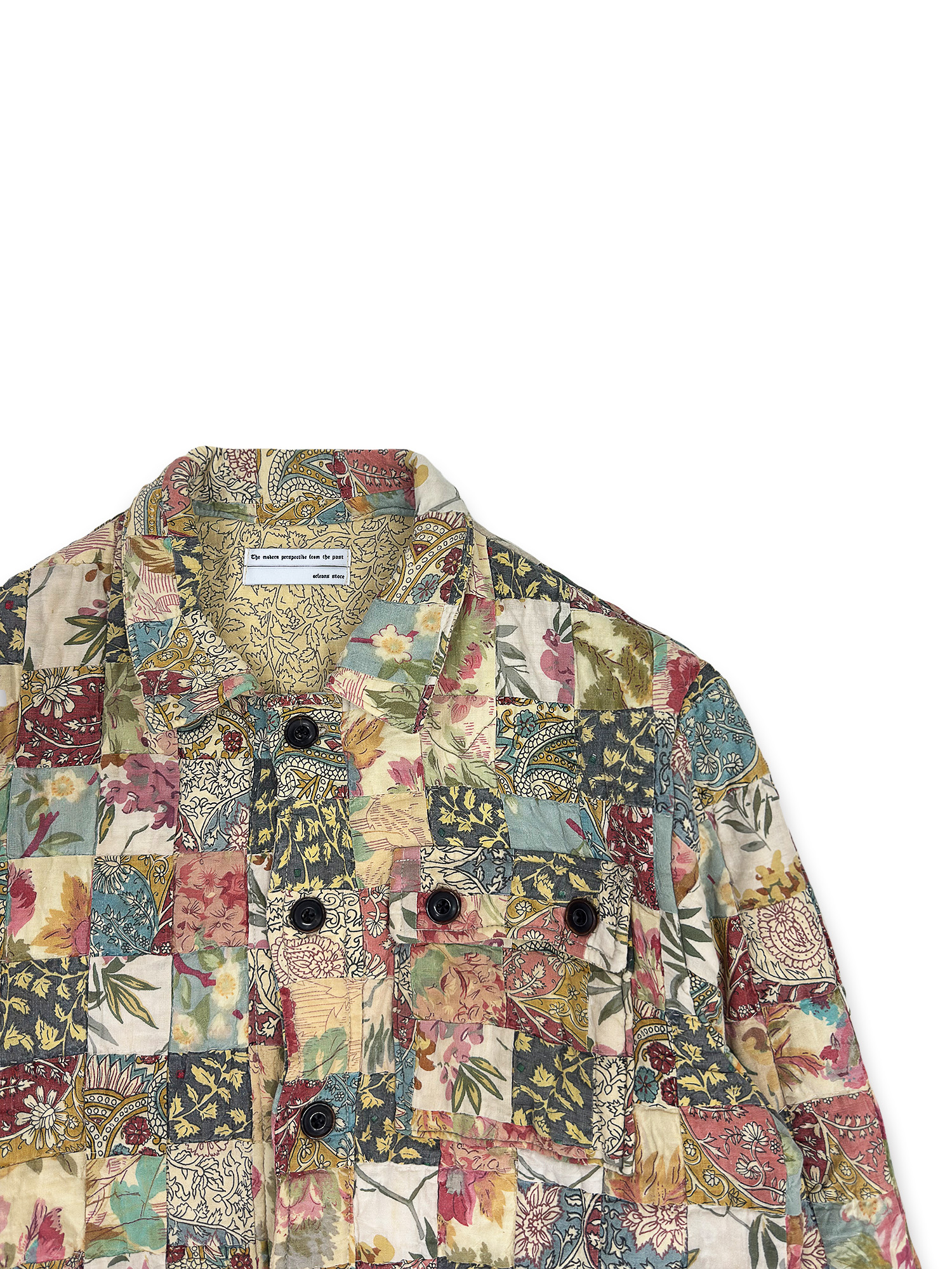 - 퀼트 패턴들이 정교하게 배열되어 있으며, 버튼 여밈과 패치 포켓의 실용적인 디테일.