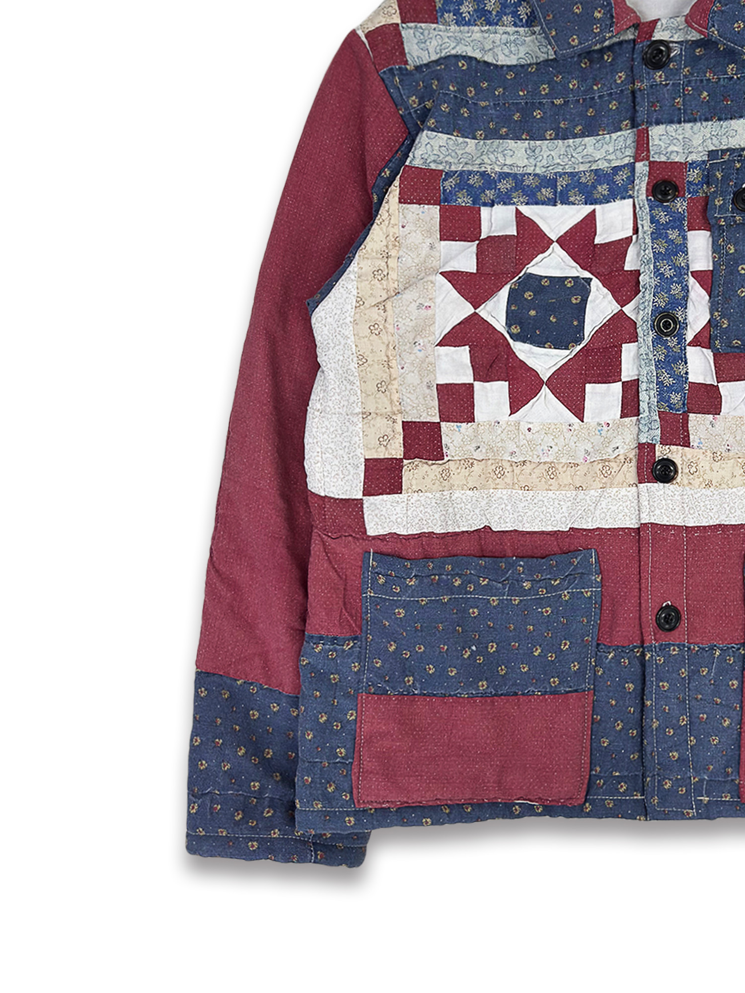 - 퀼트 패턴들이 정교하게 배열되어 있으며, 버튼 여밈과 패치 포켓의 실용적인 디테일.
