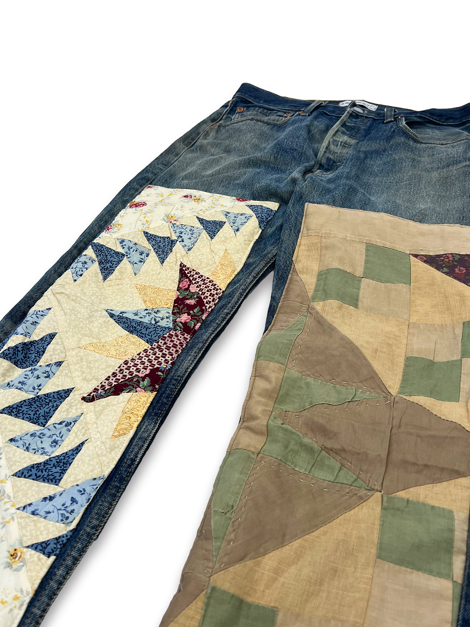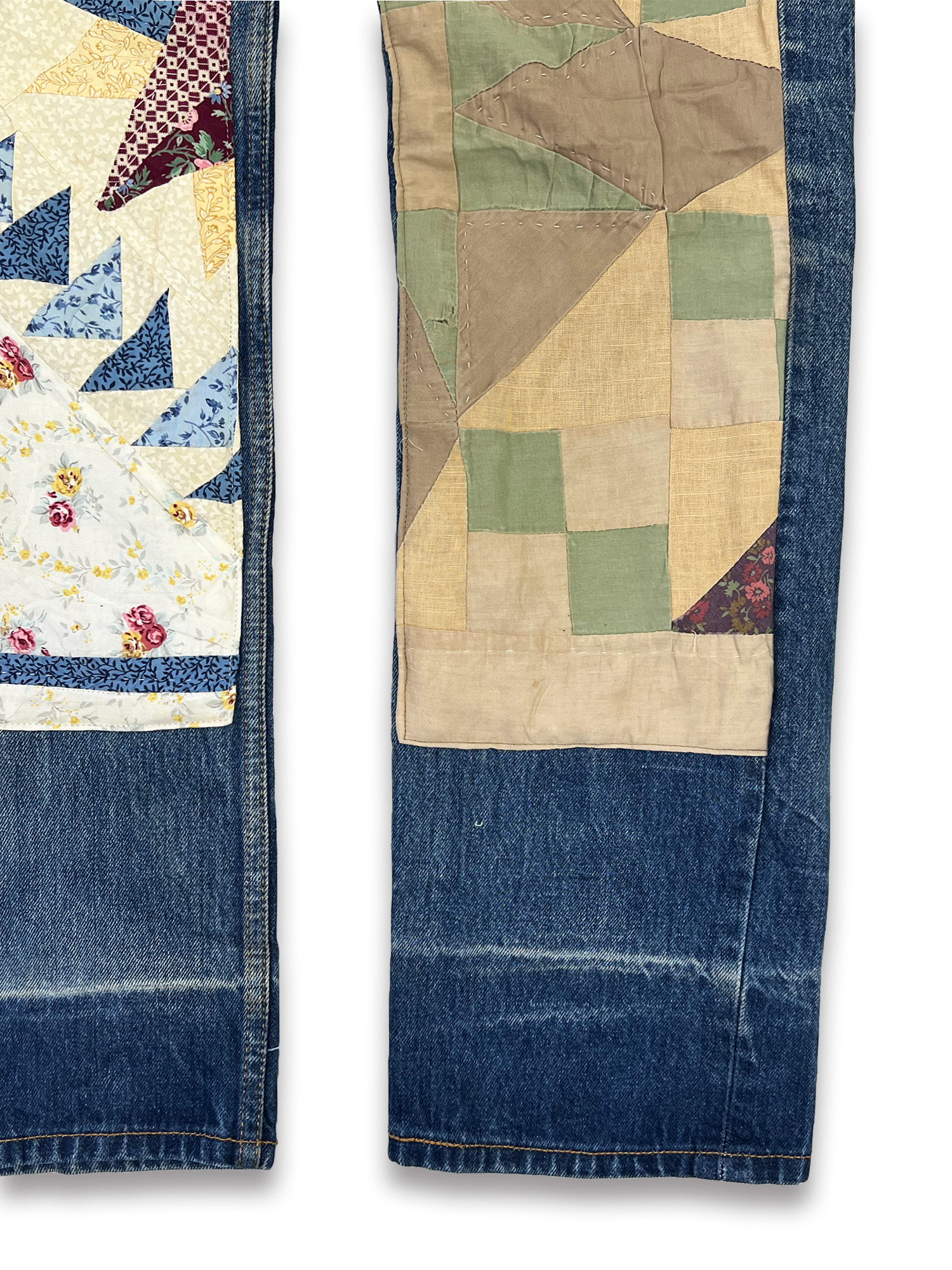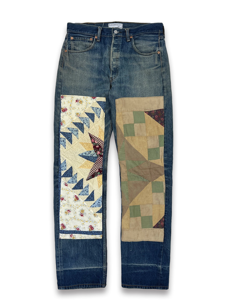 - 빈티지 워싱이 돋보이는 탄탄한 데님 원단 위에 유니크한 패치워크 디자인을 더한 팬츠.