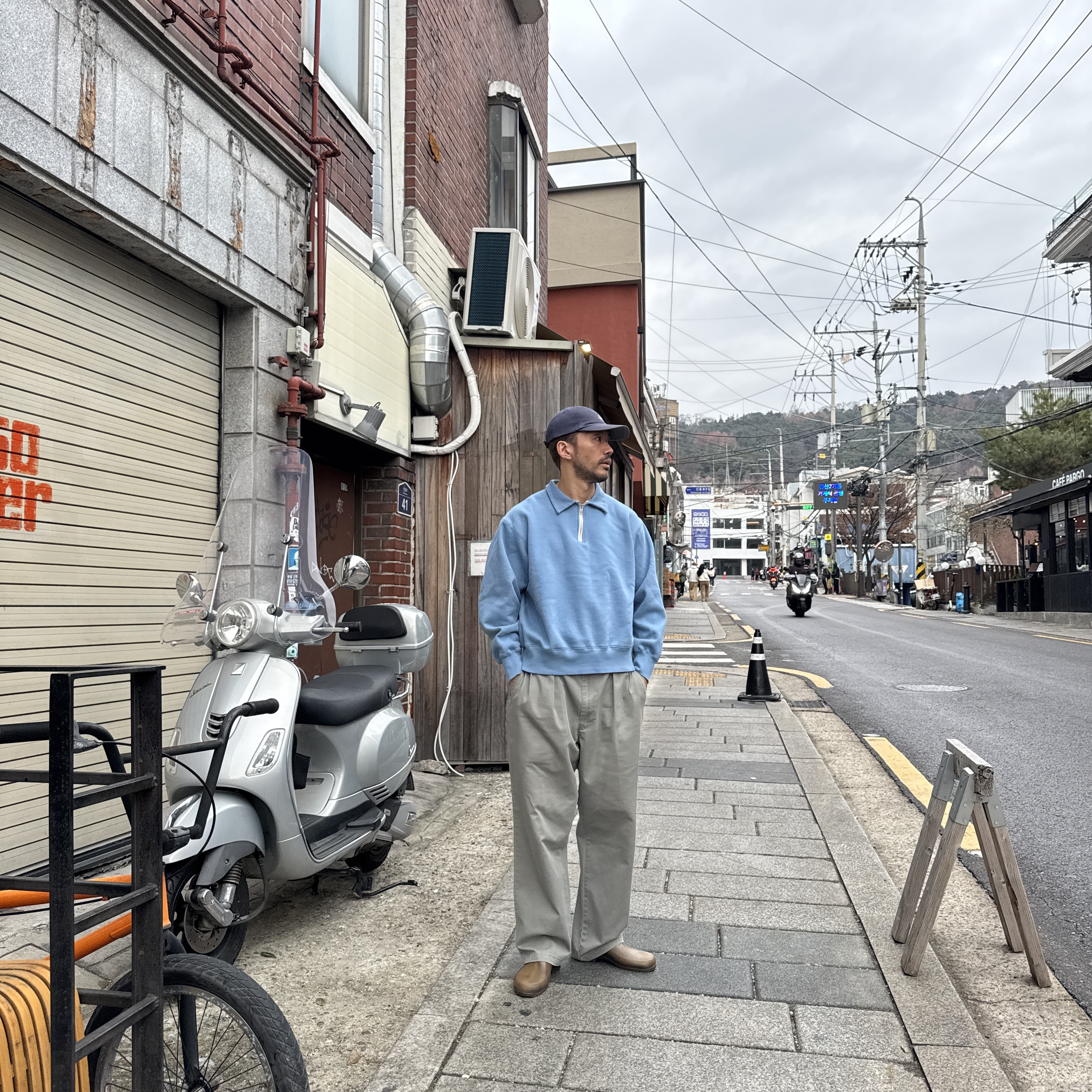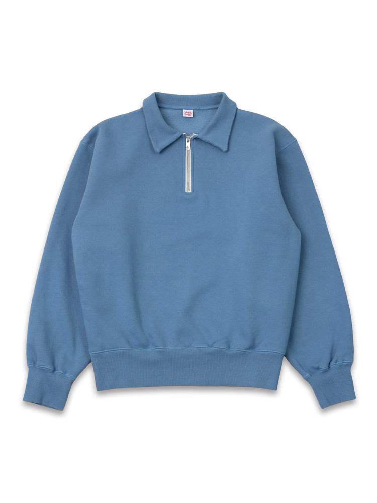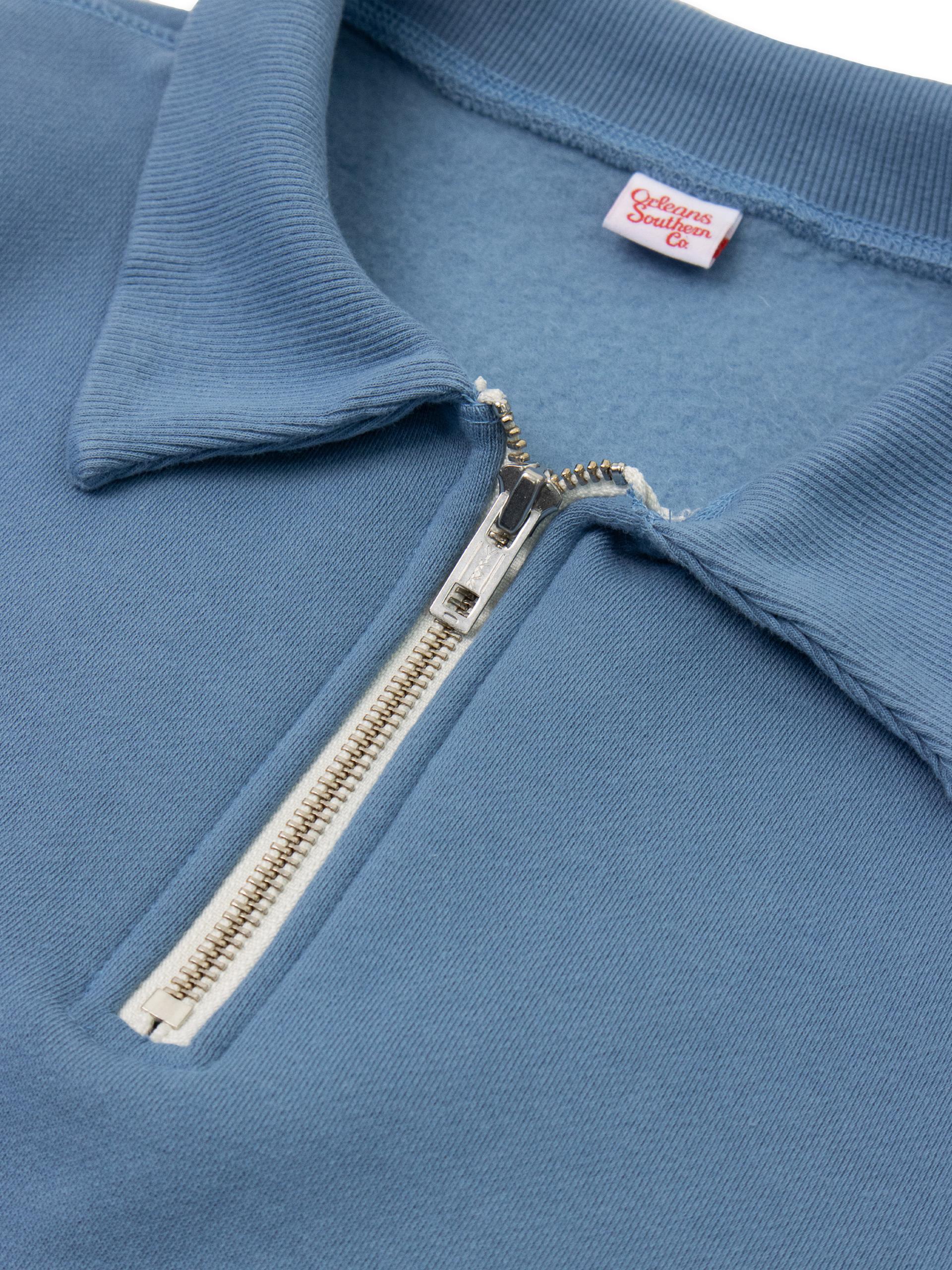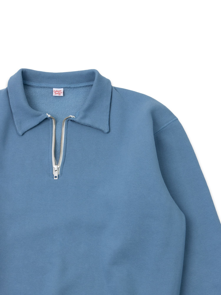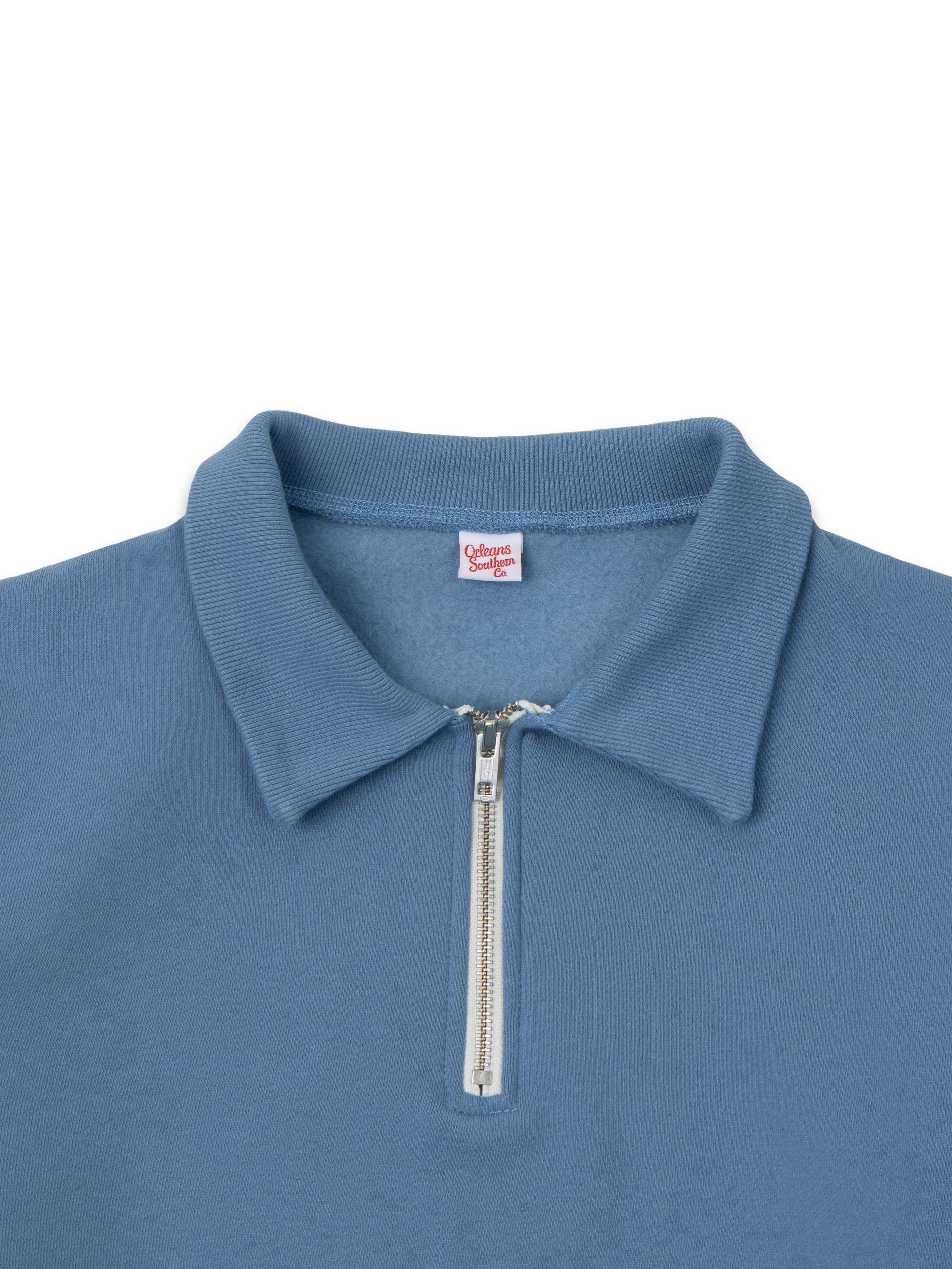 - 봉제 이음새 의 퍼커링과 하프 반 집업 디테일이 특징