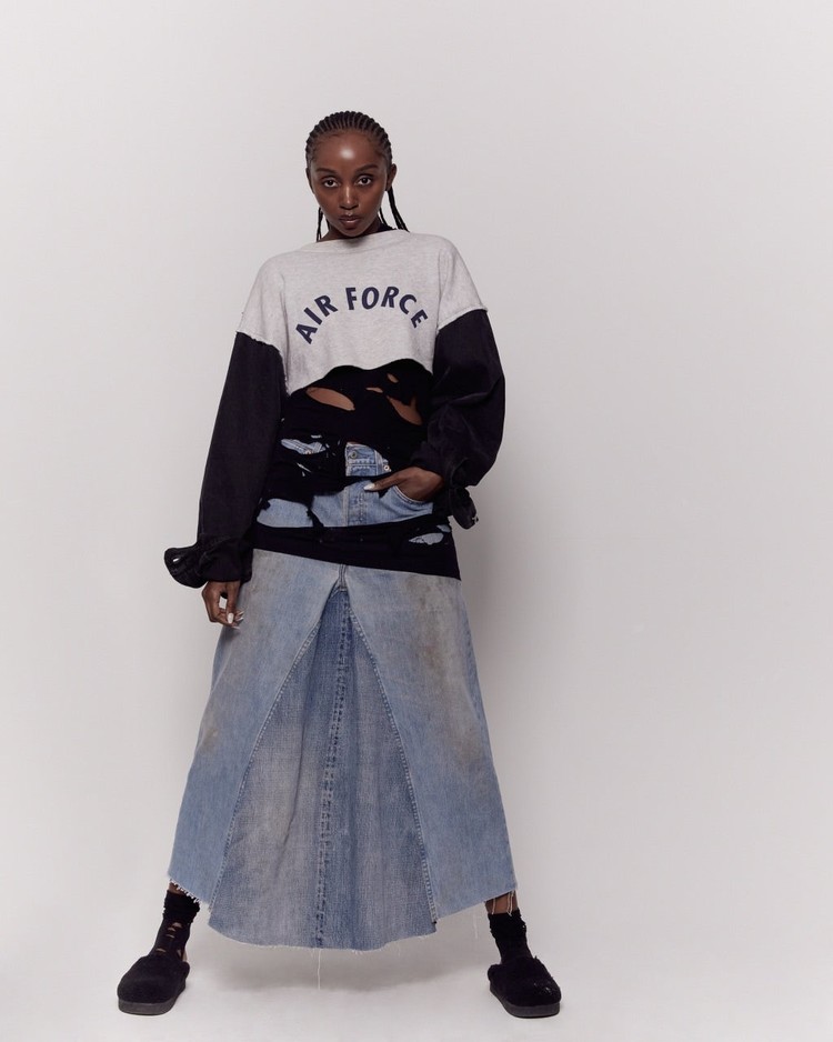 - Original air force 스웻 셔츠와 블랙 데님 자켓의 슬리브를 매칭한 풀오버